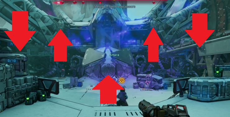 Follow Amara northeast to the Windmills area, which leads to the Temple of the Predecessors. Here, the mission becomes a gauntlet of combat as you take down waves of guards while Amara unlocks pathways and doors. Along the route, look for a side objective to destroy Eridium mining drones, which are attached to large purple crystals and easy to spot in this borderlands 4 crystal brawl walkthrough.