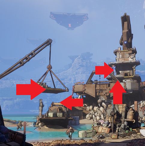 With the canister in hand, turn your gaze northward toward the imposing massive building that dominates the skyline. Your goal is to hurl the canister up onto its rooftop—aim carefully to ensure it lands securely. Once that's done, shift your attention to the nearby platforms suspended by a sturdy crane mechanism. These are your next stepping stones in this Borderlands 4 eminent husk crawler adventure.